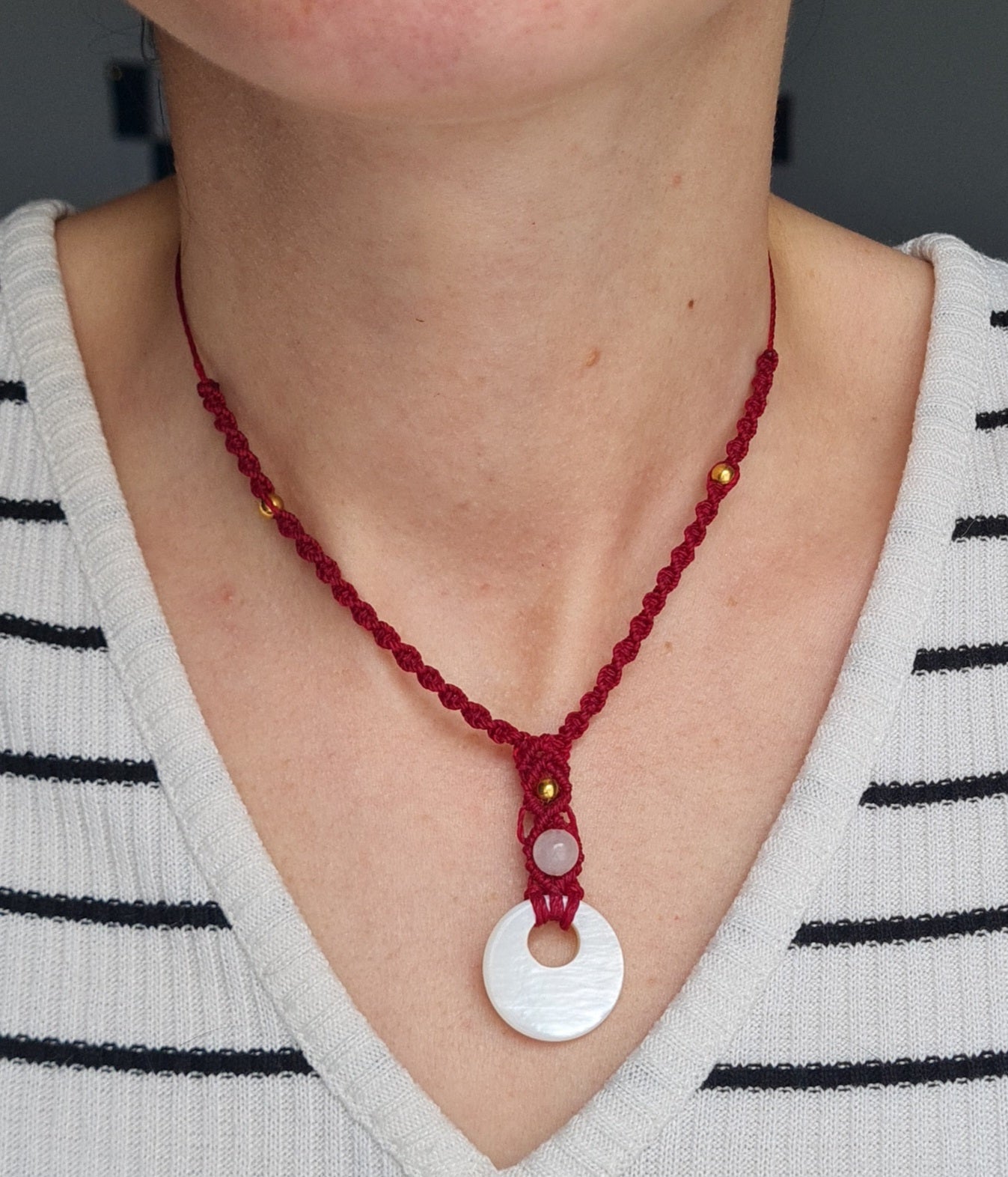 - Réalisé en micro-macramé avec du fil brésilien résistant, il est sublimé par un donut en nacre et une perle en quartz rose
